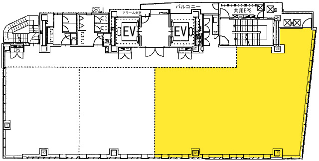※図面着色部分が募集区画となりますが、契約面積と相違する可能性があることを予めご了承ください。 ■貸室面積には、トイレ・給湯室等の按分面積が含まれます。 ■償却⇒2年未満の場合:保証金の20%、2年以上の場合:保証金の10% ■床荷重:500㎏/㎡(一部800㎏/㎡) ■コンセント容量:60VA/㎡ ■600㎜角グリッド式システム天井 ■EV⇒オフィス用:2基(17人乗・内1基非常用兼用)、店舗用:1基(13人乗)