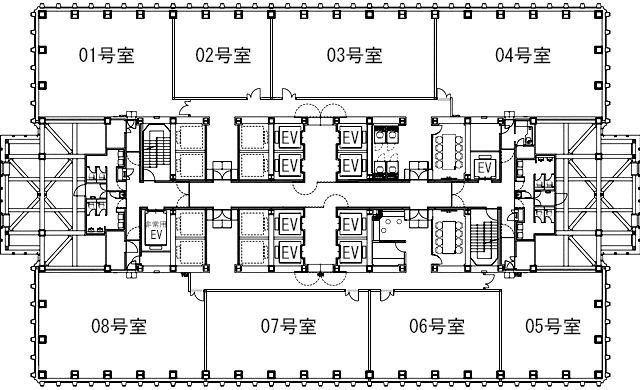 ■セットアップオフィス ■EV⇒乗用:24基(22人乗)、非常用:2基(19人乗・43人乗)、駐車場用:2基(9人乗) ■貸室面積には、共用部の面積(25.52㎡)が含まれます。 ■床荷重:300㎏/㎡ ■電気容量:30VA/㎡(50VA/㎡まで増設可能) ■その他設備⇒貸会議室・WEBブース・専用ラウンジ ■セントラル空調コアタイム:平日8:30~18:15、土日祝休止