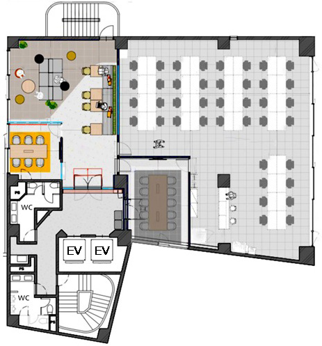 E V :2基(11人乗)、天井高:2500㎜、床仕様:OAフロア(H=50mm)、空調:個別空調、トイレ:専用 男女別 洋式