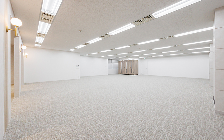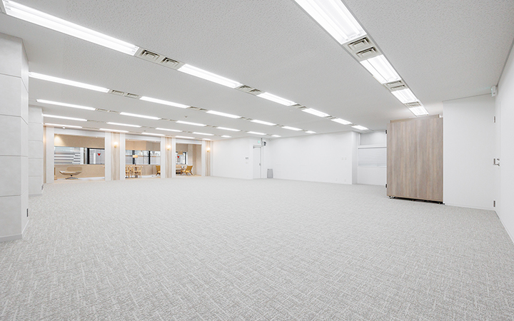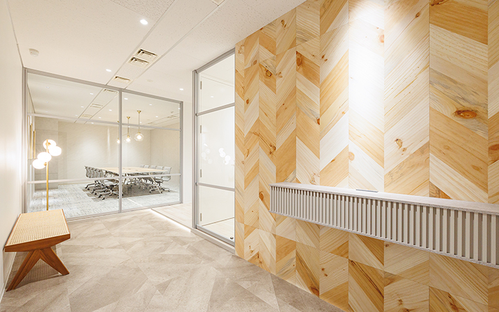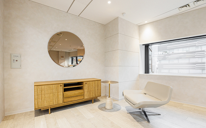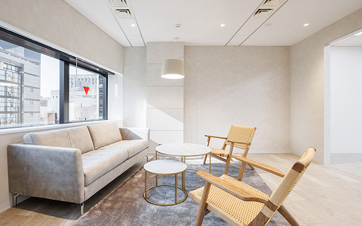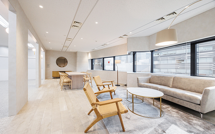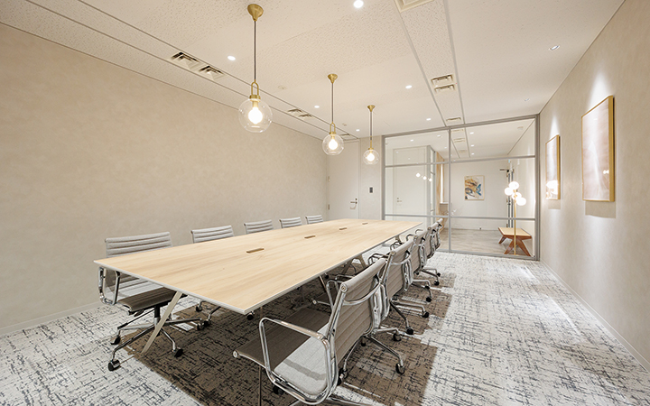 内装に豪華さを追求した造作が施され、落ち着いた雰囲気の中にも洗練された印象を与えます。会議室は6名用と10名用の2室を完備し、大小の打ち合わせに対応できる柔軟な空間設計です。一部什器も設置されており、移転に際してかかる費用や手間を軽減することが可能です。インナーラウンジは、社員同士のコミュニケーションを自然に促進し、リラックスした雰囲気の中で集中スペースとしても活用可能です。受付には、ヘリンボーン柄のデザインが施され、訪れる人に印象深い第一印象を与えます。自慢できるオフィス空間で、社員のモチベーションや幸福度も向上すること間違いなしです。