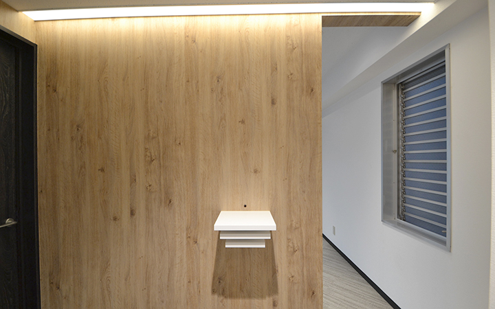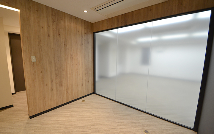 貸室内には、温かみのある雰囲気の会議室を設置。ガラスパーテーションで仕切られた空間は、3〜8名様程度でのご利用に最適です。シンプルでレイアウトしやすい内装に加え、木目調のオシャレな受付台も設置済み。居心地の良さと機能性を兼ね備えた空間を提供いたします。